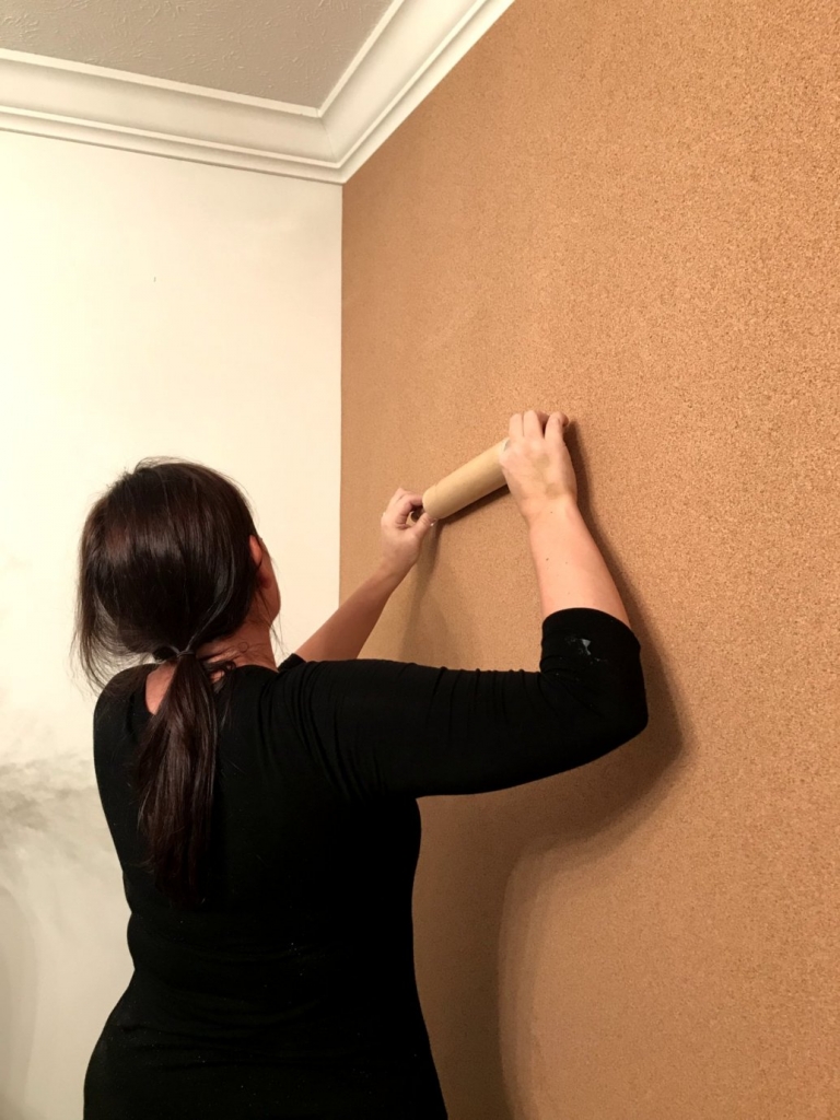 Både korken och väggen ska vara torra och jämna. Var särskilt försiktig när du applicerar korken, eftersom limmet torkar mycket snabbt, vilket kräver stor precision. Det är bäst att tre personer applicerar rullen på ytan som ska limmas. Två personer rullar ut rullen och den tredje personen trycker den jämnt med en roller för att säkerställa att den fäster mot väggen över hela ytan.